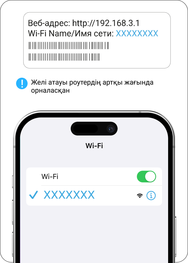 Мобильді телефонды немесе компьютерді роутердің Wi-Fi желісіне қосыңыз (пароль қажет емес). Роутердің төменгі панеліндегі Wi-Fi желісінің атауын (Wi-Fi name) тексеріңіз.