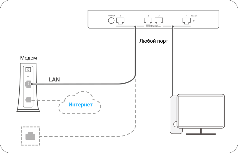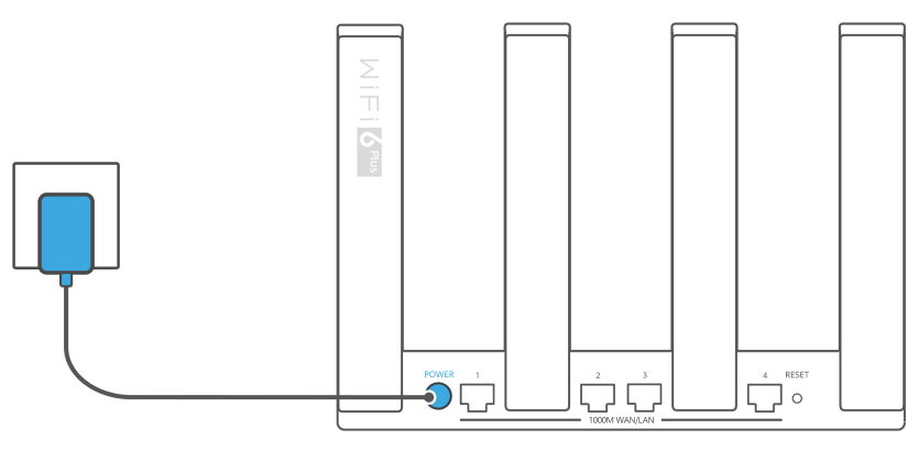 Подключите к роутеру адаптер питания, а затем с помощью сетевого кабеля подключите порт WAN или автоопределяющийся порт WAN/LAN роутера к порту LAN оптического или широкополосного модема либо к сетевому порту на стене. (Установите все антенны в вертикальное положение для оптимального сигнала Wi-Fi).